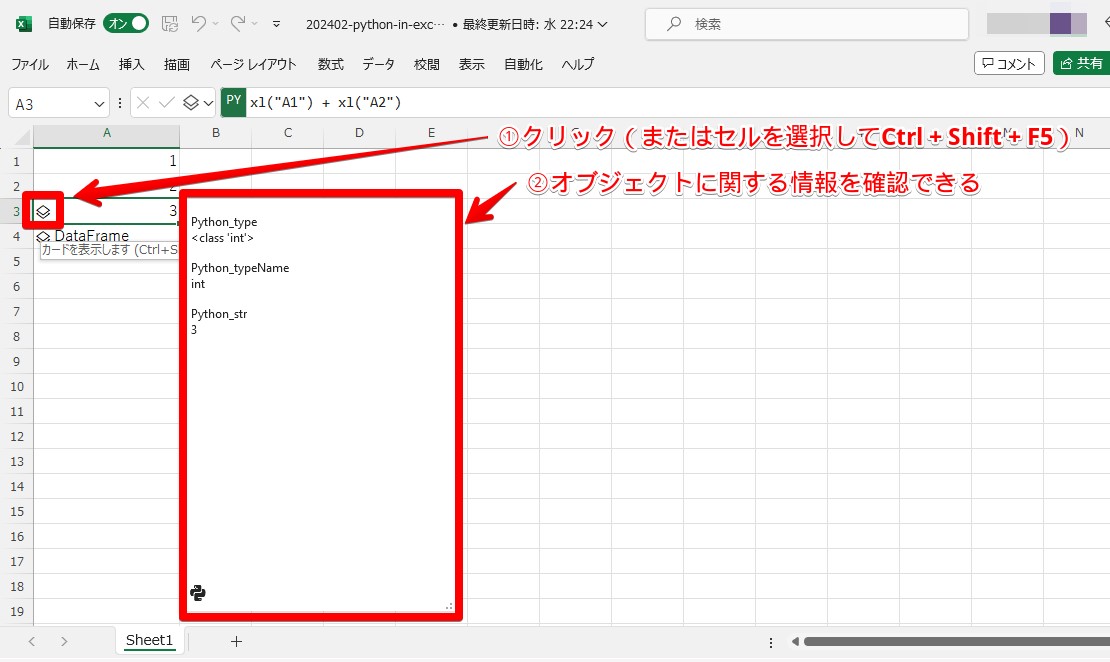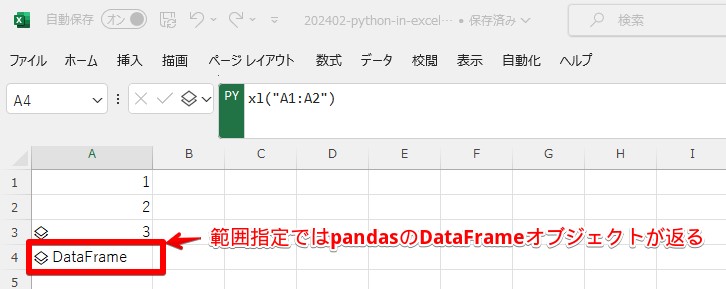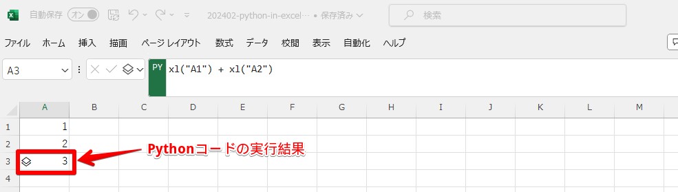 というExcel関数にPythonコードを渡すことでPythonを実行し、結果をセルに埋め込むことができます。