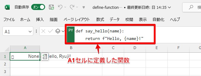 定義した関数はExcelブックの中で同一スコープになるので、A1セルのNone