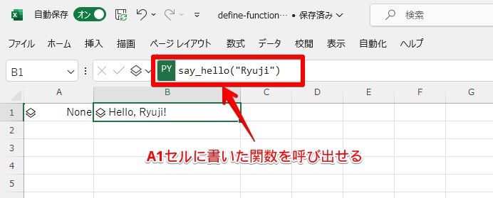 A1セルに定義した関数をB1セルで呼び出す¶