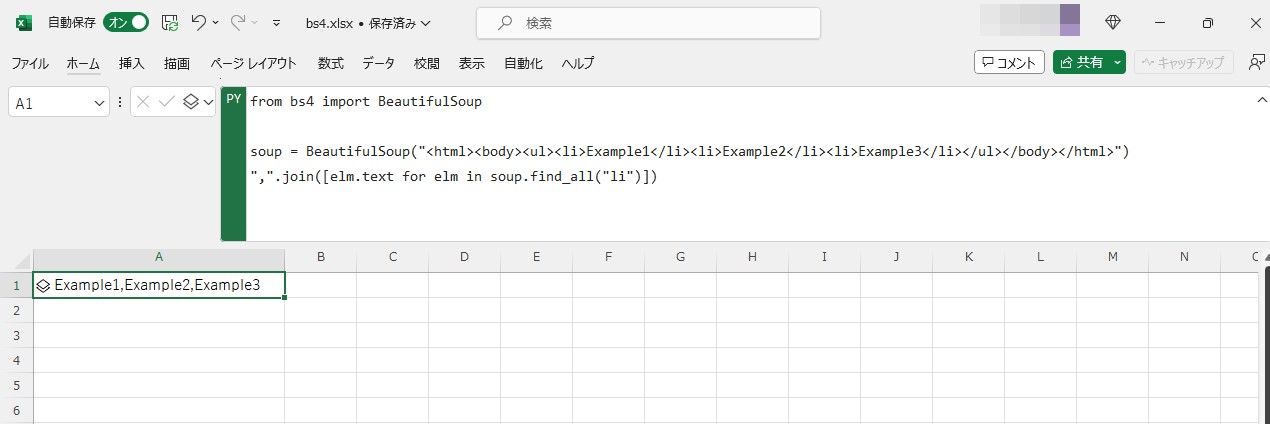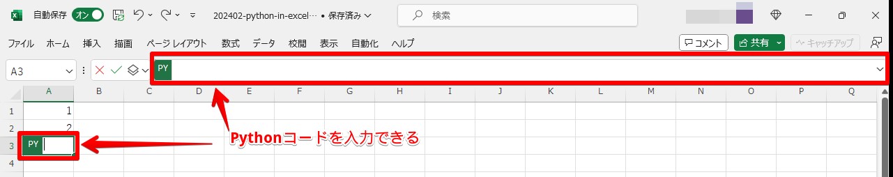 Python in Excelでは、=PY()