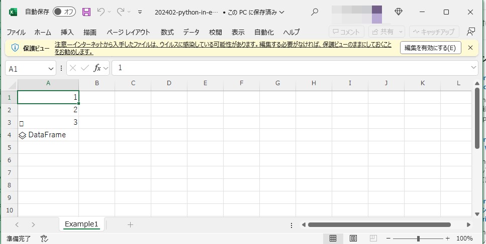 Pythonコードが含まれているExcelファイルの入手元がインターネットまたは信頼されていないソースの場合、これを開くと保護ビューが有効になり、Pythonは実行されません。