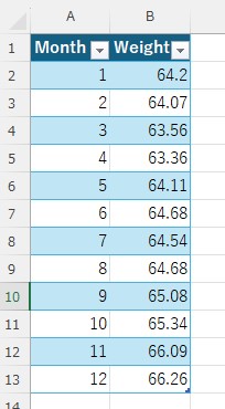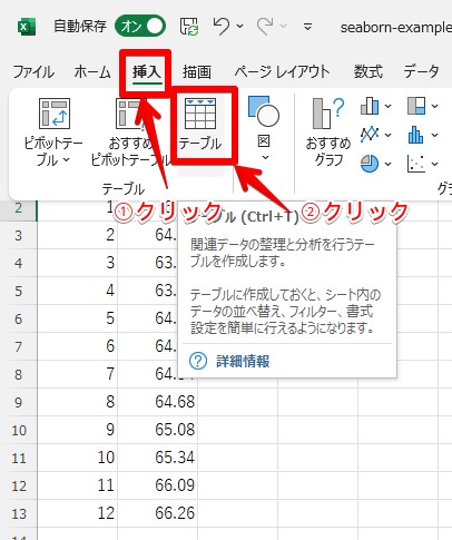 関数でデータを参照する際に必要です。テーブルの挿入は画面上のメニュー[挿入]-[テーブル]をクリックするか、入力したデータのどこかのセルを選択してCtrl + Tで実行できます。