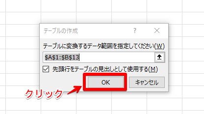 ダイアログが表示されたらセルの範囲は変更せず「OK」ボタンをクリックします。これで、テーブルが挿入されます。