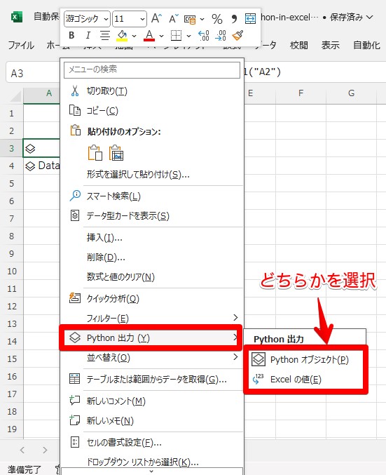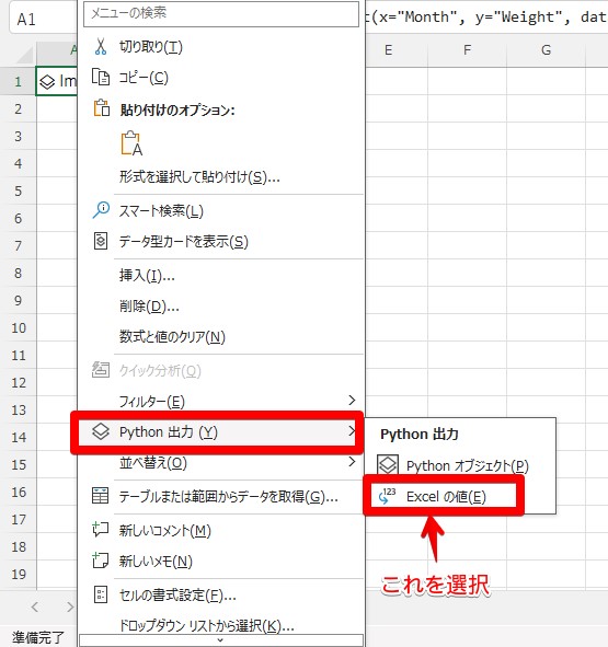 graphシートのA1セル上でCtrl + Enterキーを押すとPythonコードが実行されますが、デフォルトの出力形式「Pythonオブジェクト」だとグラフが表示されません。A1セルを右クリックして、メニューの[Python出力]から[Excelの値]を選択します。