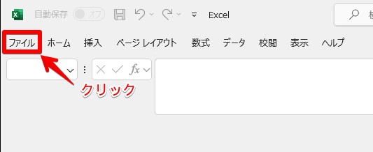 Excelを起動し、メニューの[ファイル]をクリックします。