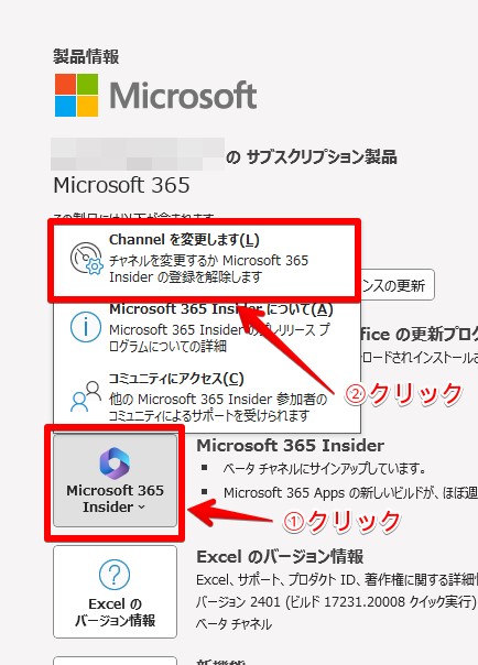 「Microsoft 365 Insider」のアイコンをクリックし、表示されるメニューの「Channelを変更します」をクリックします。