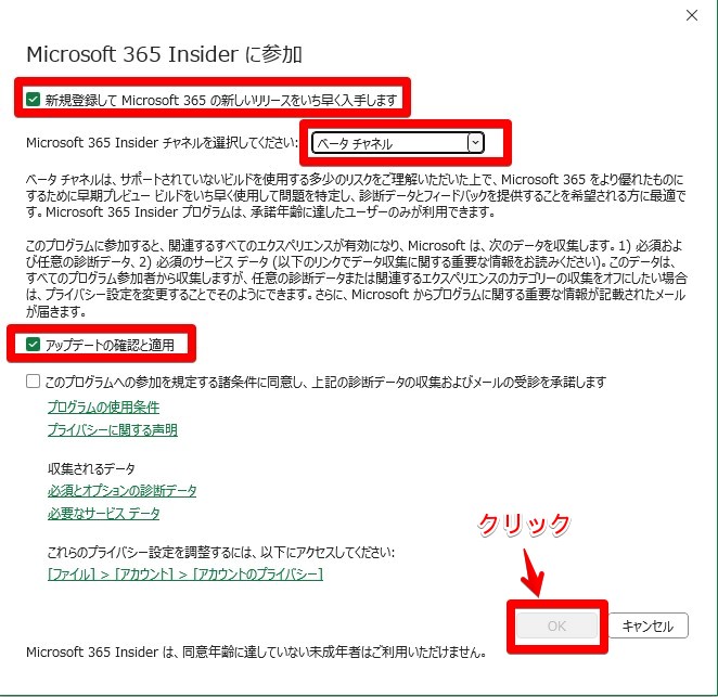 ダイアログを以下の状態に変更してから「OK」ボタンをクリックします。これで、ベータチャネルにサインアップできました。