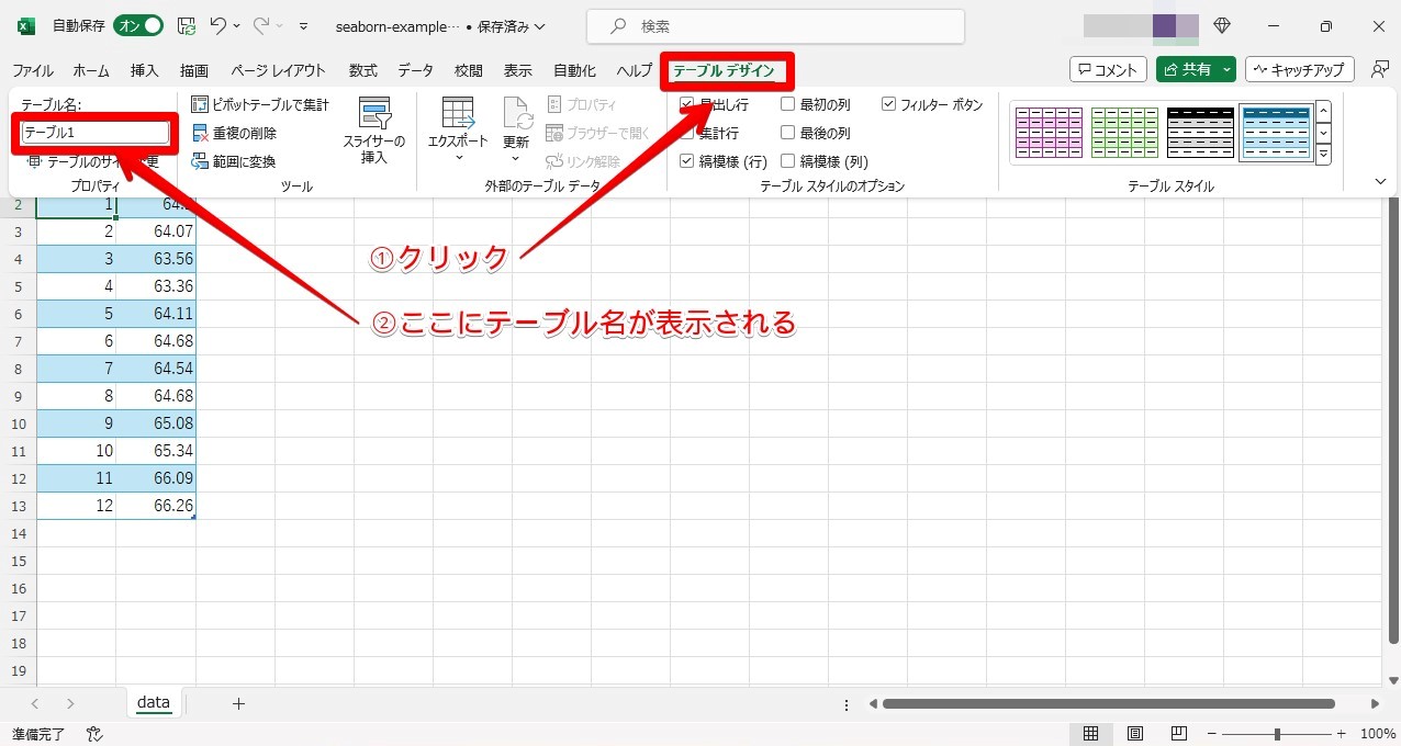 というテーブル名は、テーブルのどこかを選択してからメニューの[テーブルデザイン]で確認できます。また、名前の変更もできます。
