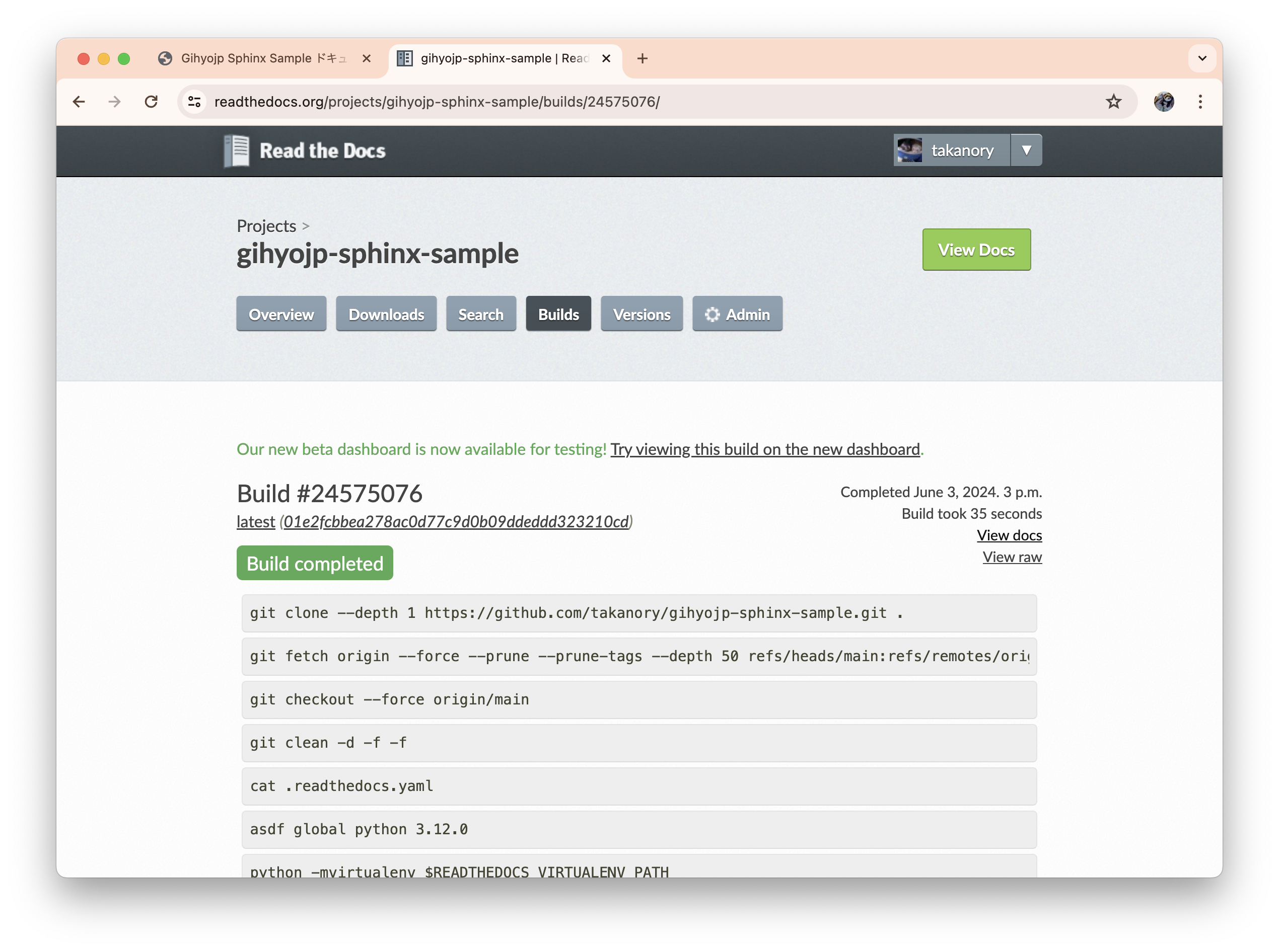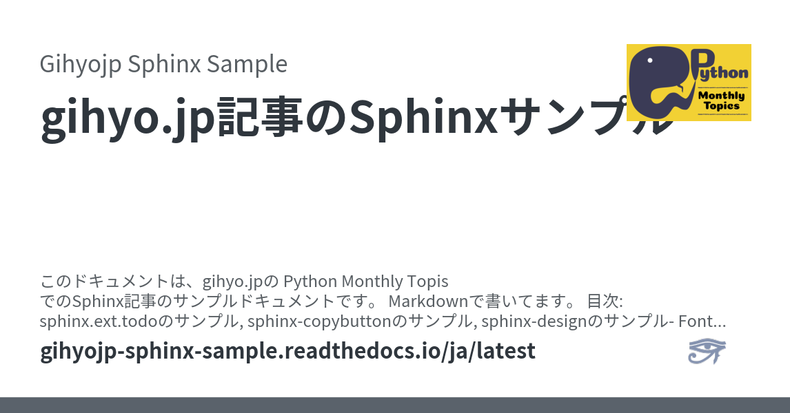 <meta property="og:description" content="このドキュメントは、gihyo.jpの Python Monthly Topis でのSphinx記事のサンプルドキュメントです。 Markdownで書いてます。 目次: sphinx.ext.todoのサンプル, sphinx-copybuttonのサンプル, sphinx-designのサンプル- Font Awesome, Material Icons.. TODOリスト:( 元のエン..." />