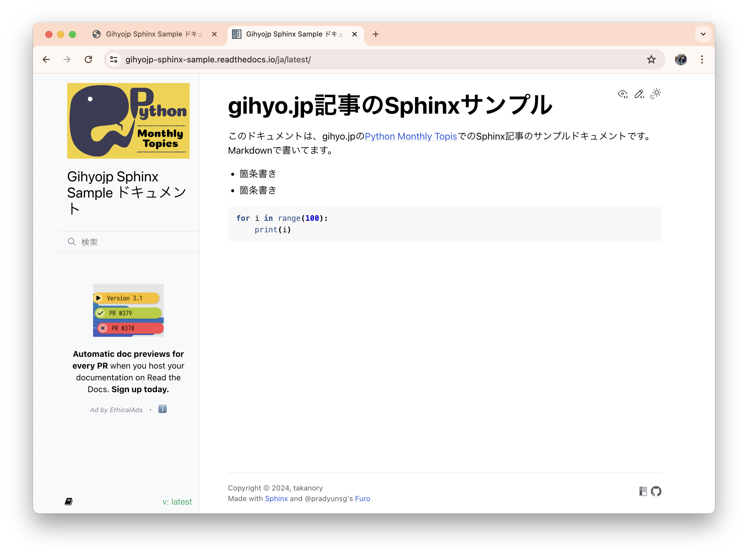 このドキュメントは、gihyo.jpのPython Monthly Topics(https://gihyo.jp/list/group/Python-Monthly-Topics)でのSphinx記事のサンプルドキュメントです。