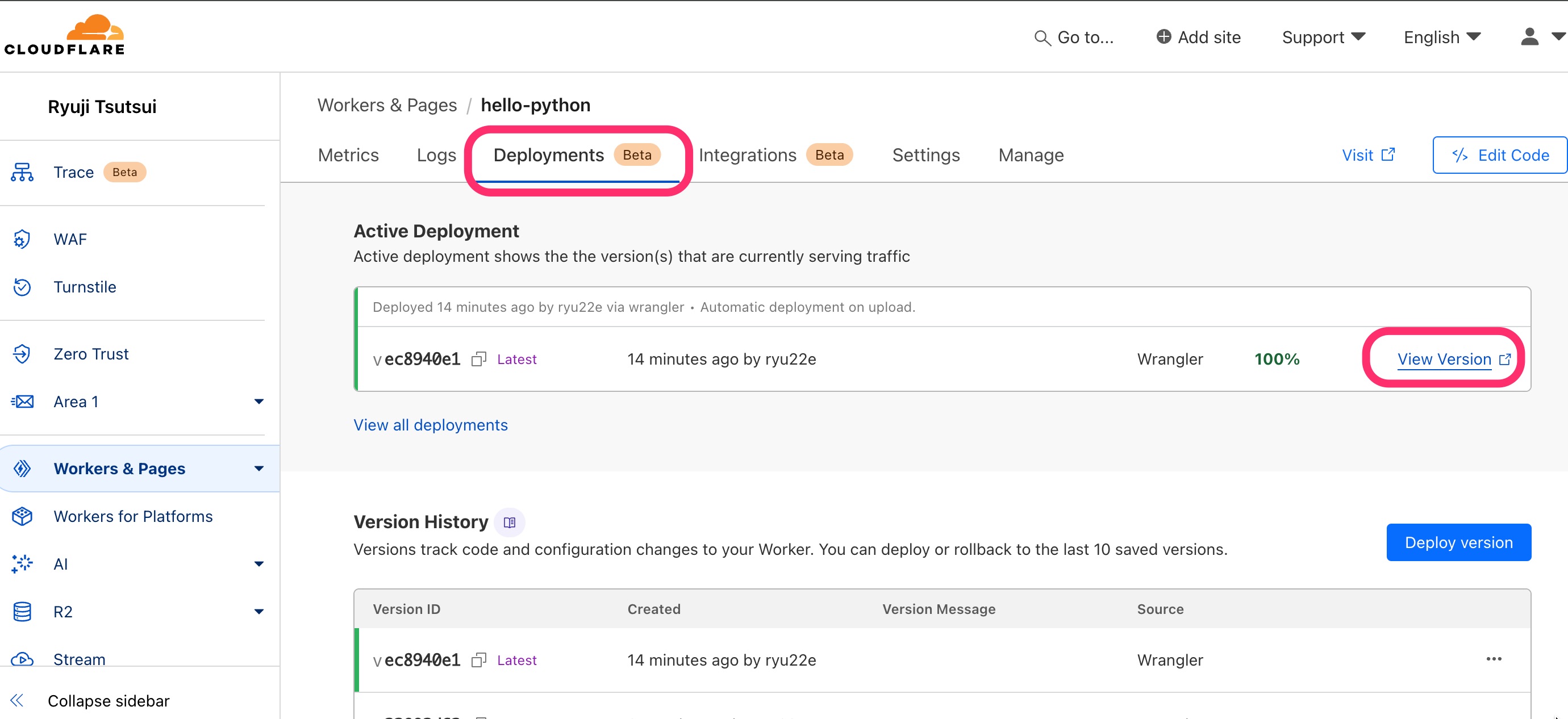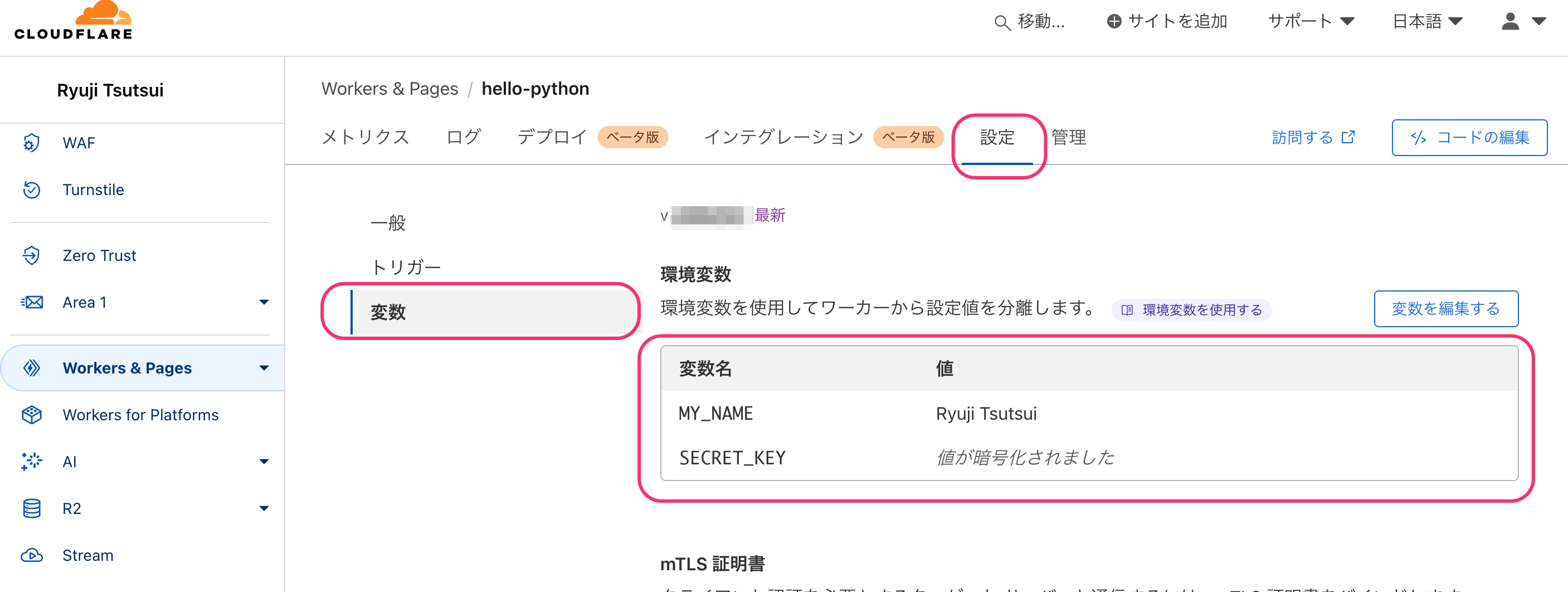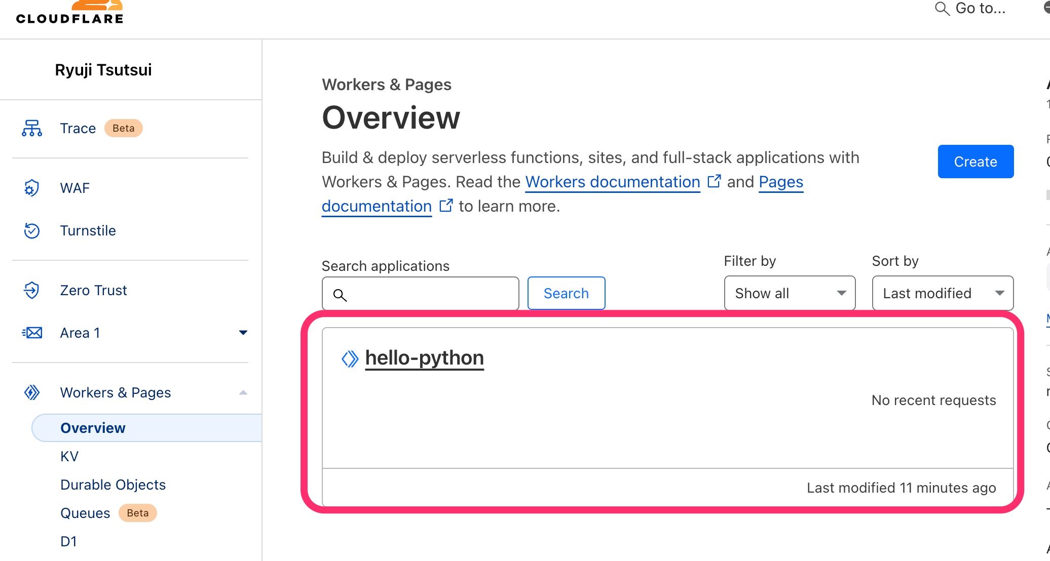 CloudflareダッシュボードのWorkers & Pagesには、今デプロイしたアプリケーション「hello-python」が表示されているはずです。