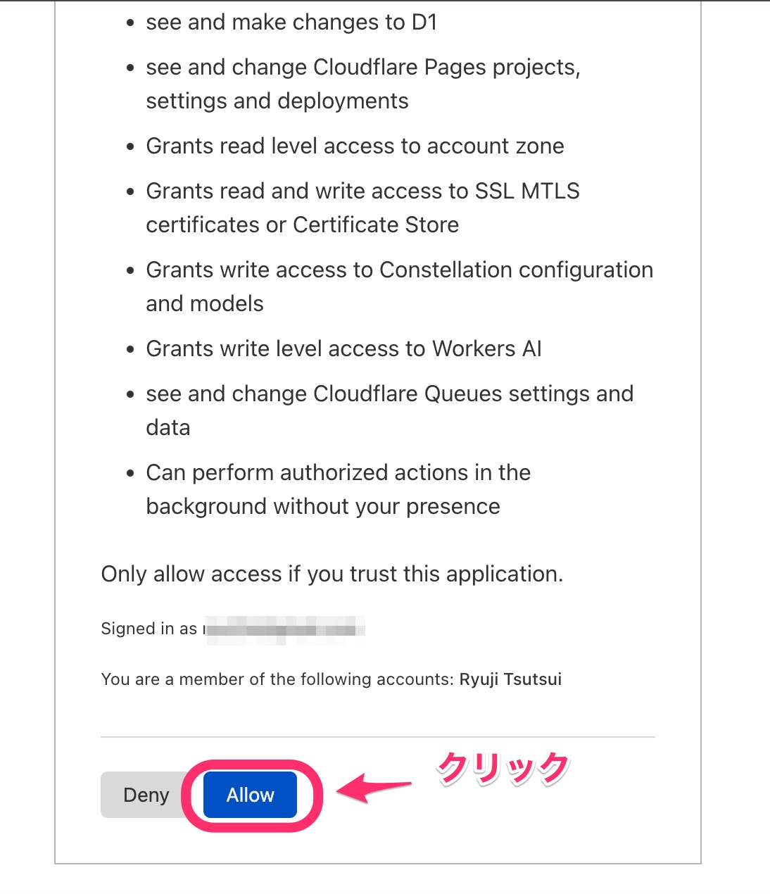 コマンド実行後、以下のようなアプリケーションのデプロイを許可する画面が表示されます(Cloudflareにログインしていない場合はログイン画面が表示されます)。 「Allow」をクリックしてください。