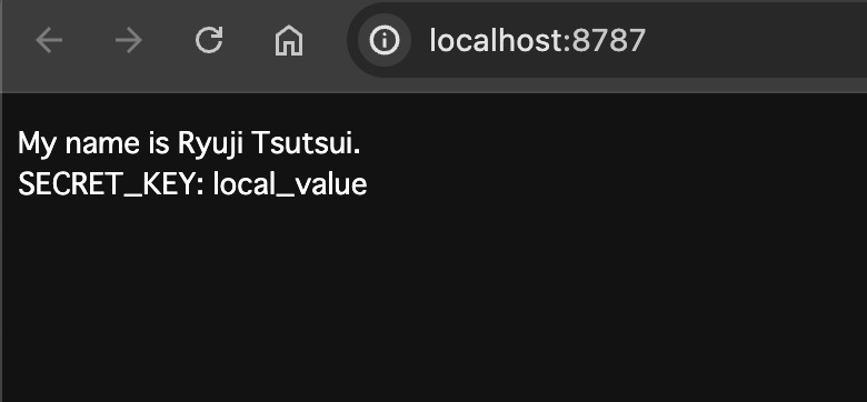 を実行すると、以下のようにwrangler.tomlと.dev.varsに書かれた環境変数の値が表示されます。